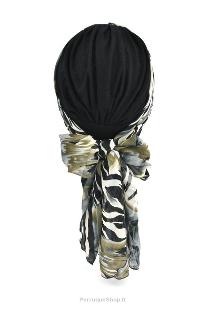 Turban mit einem langen, dekorativen Band in sehr hübschen Mustern. Das bunte Band bietet viele Stylingmöglichkeiten. Der Turban selbst ist reichlich gerafft, was für optisches Volumen sorgt.