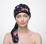 Turban mit einem langen, dekorativen Band in sehr hübschen Mustern. Das bunte Band bietet viele Stylingmöglichkeiten. Der Turban selbst ist reichlich gerafft, was für optisches Volumen sorgt.
