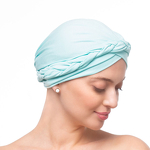 Ein einzigartiger Turban für das tägliche Tragen. Die Drapierung um den Kopf erinnert an das Binden eines Zopfes. Das Gesamtbild ist charmant und zart. Glatter, gleichmäßiger Turban aus natürlichen und elastischen Materialien. Er passt sich dem Kopf an, drückt ihn aber nicht zusammen.