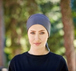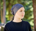 Ein einfach zu stylender, leichter und bequemer Turban in Form eines Tuchs. Er hat zarte Drapierungen an den Seiten und kurze Bänder zum Binden auf der Rückseite. Er ist aus natürlichen Materialien gefertigt.