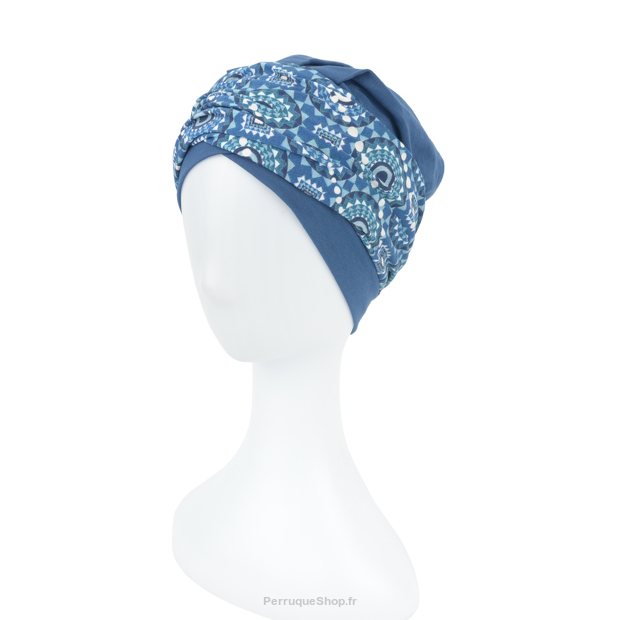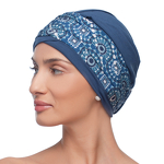 Ein klassischer Turban für den täglichen Gebrauch. Das leichte und luftige Material sorgt dafür, dass die Kopfhaut auch an sehr warmen Tagen frei atmen kann. Ein hinten festgestecktes gemustertes Band gibt Form und verleiht dem Styling Charakter.