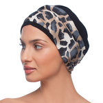 Ein klassischer Turban für den täglichen Gebrauch. Das leichte und luftige Material sorgt dafür, dass die Kopfhaut auch an sehr warmen Tagen frei atmen kann. Ein hinten festgestecktes gemustertes Band gibt Form und verleiht dem Styling Charakter.