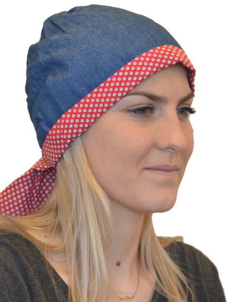 Zweiseitiger Turban, Kombination aus dünnem Jeansstoff und Baumwolle. Mit sehr bequemen, kurzen Bändern zum schnellen Binden am Hinterkopf. Ein klassischer und bequemer Jeansstoff - eine praktische Lösung für jeden Tag, als Ergänzung zum Outfit, zum Schutz vor Sonne oder Kälte.