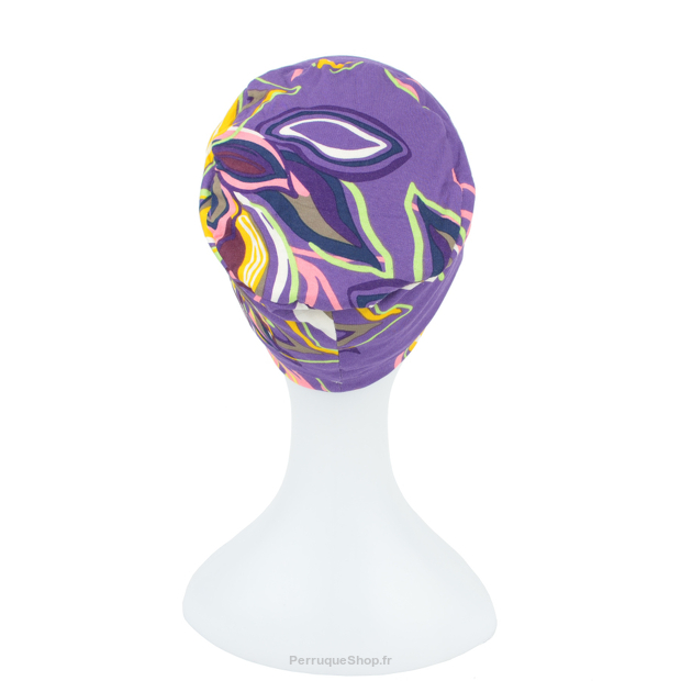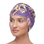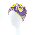 Leichter, luftiger Turban mit einem ausdrucksstarken, abstrakten Muster. Das elastische Material drückt auch nach stundenlangem Tragen nicht auf den Kopf.