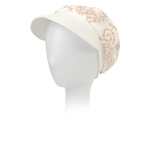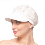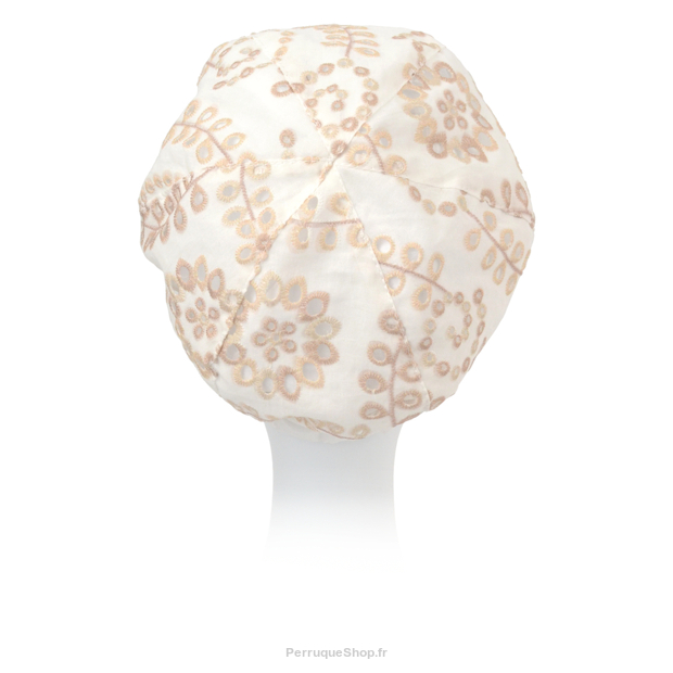 Turban für den täglichen Gebrauch. Der Schirm schützt vor Sonneneinstrahlung. Das bequeme Modell aus natürlicher Baumwolle sorgt für Atmungsaktivität auf der Haut. Er ist vollflächig mit einer zarten Zierstickereien versehen, die dem Ganzen eine interessante Struktur verleihen.