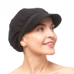 Turban für den täglichen Gebrauch. Der Schirm schützt vor Sonneneinstrahlung. Das bequeme Modell aus natürlicher Baumwolle sorgt für Atmungsaktivität auf der Haut. Er ist vollflächig mit einer zarten Zierstickereien versehen, die dem Ganzen eine interessante Struktur verleihen.