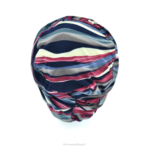Das Turbanmuster ist in vielen intensiven Farben gestreift. Dank der satten Farben gewinnt das Bild der Person, die dieses Turban-Modell trägt, an fröhlichen und lebendigen Elementen.