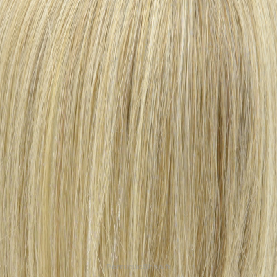 Die Montur der hier vorgestellten Halbperücke besteht aus Strähnen, die in das Haarteil eingewebt sind, mit einer Strähne aus Monofilament an der Spitze (dadurch ist die Haut natürlich sichtbar und der Eindruck wird erweckt, dass die Haare natürlich wachsen). Durch den verschwommenen Haaransatz vorne kann der Pony nach oben gezogen und die Stirn ungehindert freigelegt werden.