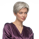Die Montur der hier vorgestellten Halbperücke besteht aus Strähnen, die in das Haarteil eingewebt sind, mit einer Strähne aus Monofilament an der Spitze (dadurch ist die Haut natürlich sichtbar und der Eindruck wird erweckt, dass die Haare natürlich wachsen). Durch den verschwommenen Haaransatz vorne kann der Pony nach oben gezogen und die Stirn ungehindert freigelegt werden.