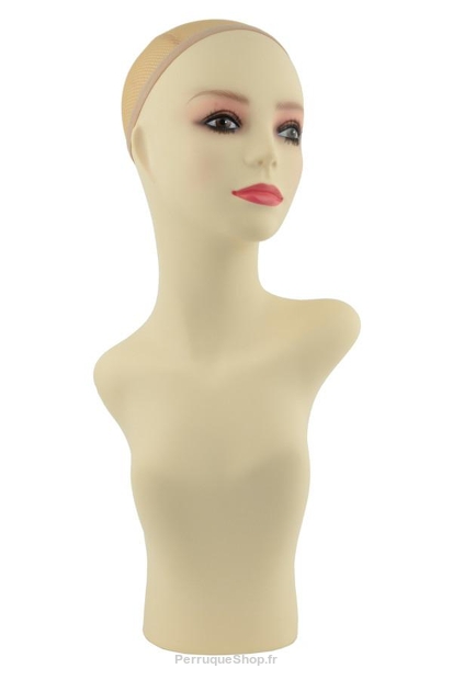 Er hat eine neutrale Fleischfarbe, die der Haut ähnelt (weder zu gelb noch zu rosa) und aufgeklebte Wimpern. Seine Oberfläche ist nicht übermäßig rutschig. Ein Vorteil des Kopfes ist das fest angebrachte Netz, das dafür sorgt, dass die Perücke oder das Produkt an ihrem Platz bleibt und nicht abrutscht. Der Kopf ist durch sein Gewicht sehr stabil und kann auch auf einem Stativ (z. B. zum Fotografieren) befestigt werden.