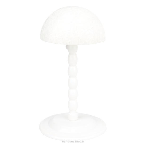 Der obere Teil des Ständers, der so genannte Halbkopf, ist mit einem weißen Spitzenstoff überzogen. Das Material hat eine Textur, die das Verrutschen der Perücke verhindert. Dadurch wird das Risiko verringert, dass die Perücke vom Ständer rutscht und schmutzig oder staubig wird.