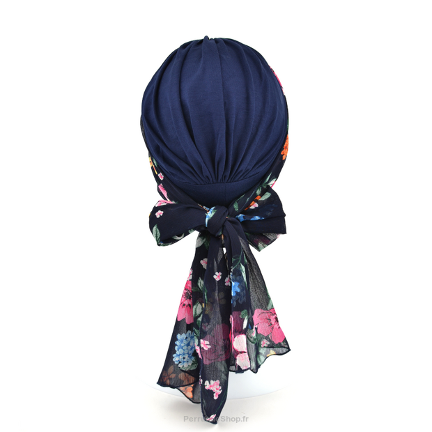 Turban mit einem langen, dekorativen Band in sehr hübschen Mustern. Das bunte Band bietet viele Stylingmöglichkeiten. Der Turban selbst ist reichlich gerafft, was für optisches Volumen sorgt.
