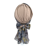 Nichts hindert Sie daran, diese Kopfbedeckung im Alltag allein zu tragen. Optisch gewinnt der Turban jedoch deutlich, wenn er mit einer der Bänder gebunden wird. Der Stoffstrang kann auf verschiedene Arten am Rücken gebunden werden. Die gängigsten sind der Knoten und die Schleife. Sie können das Band auch andersherum binden und eine dekorative Schleife auf die Stirn legen.