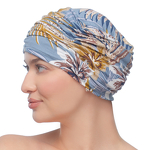 Leichter, luftiger Turban mit einem ausdrucksstarken, abstrakten Muster. Das elastische Material drückt auch nach stundenlangem Tragen nicht auf den Kopf.